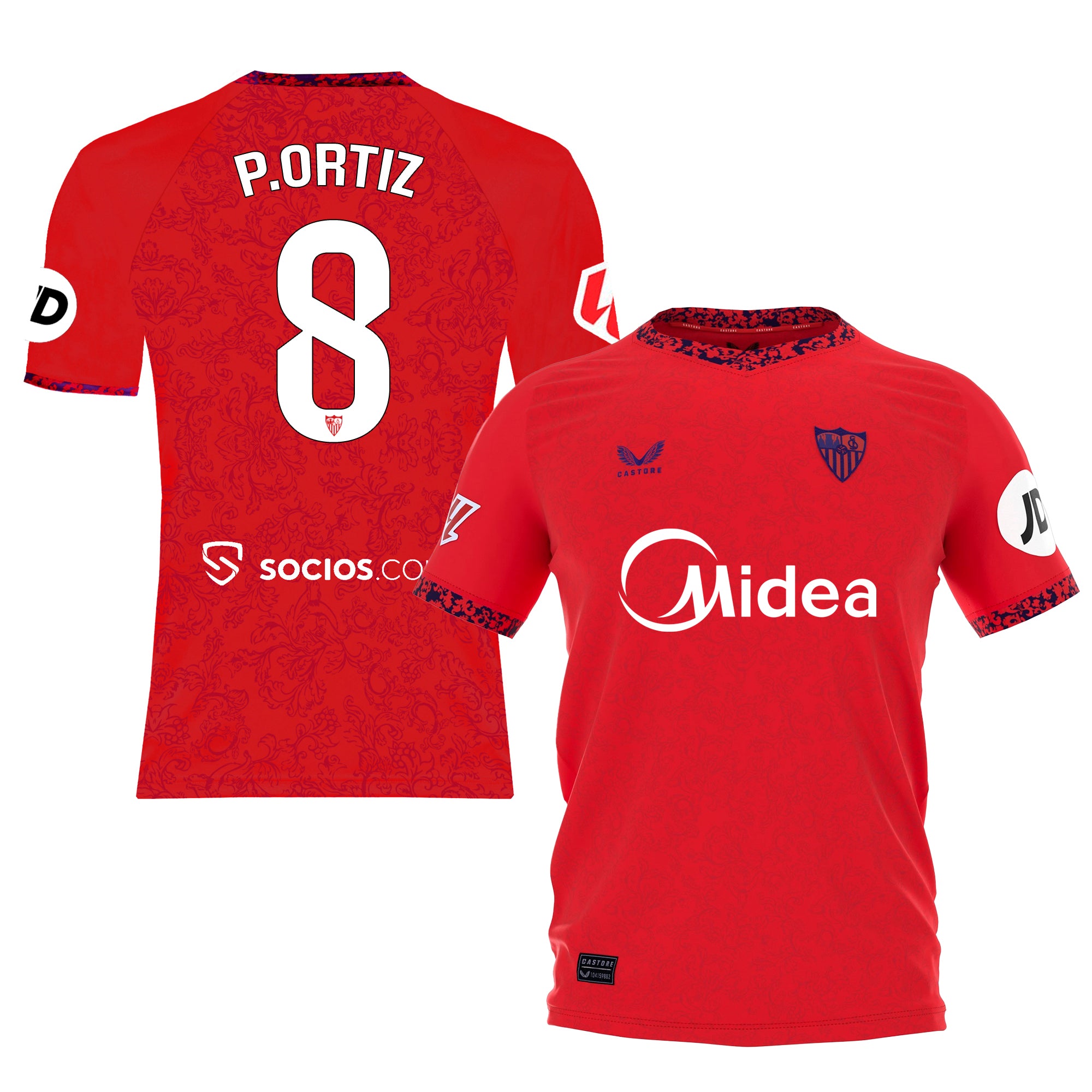 Second kit shirt with number 8 and the screen print of Sevilla FC player P. Ortiz. Season 24/25. Don’t miss out on yours!